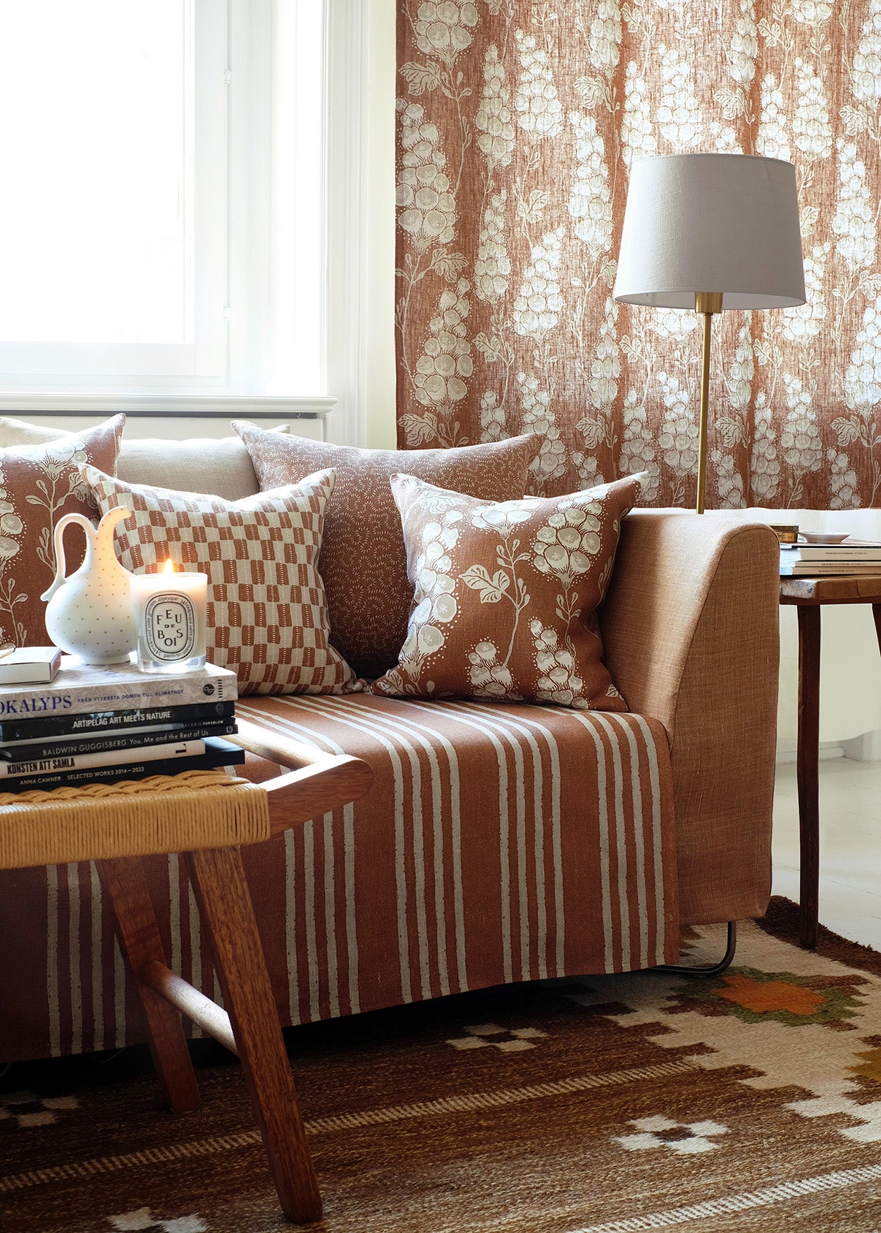 The colors of the print are vibrant or soft, but always natural and a part of our unique colour DNA. Flora is drawn by hand and is printed by our Master printers on our beautiful and sustainable, high quality linen weave, which is lively and make our patterns age with grace.