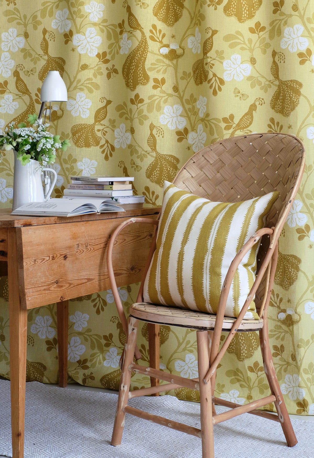 A light sunny yellow version of our Night Birds print complimenting the long time favourite colourway Ivory/Blue, also available as fabric and wallpaper. In 1750 Night Birds could have been the print for a silk dress, but today it's used for cushions, a bed canopy, blinds or lounge chair for a contemporary living.