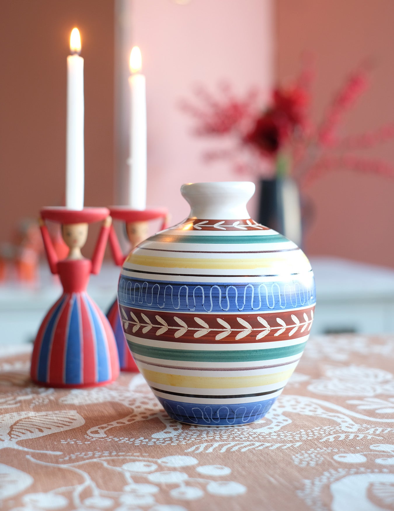 This beautiful mid century ceramic vase with deep colours is made by famous Swedish producer Nittsjö Keramik and designer Erik Mornils (1925-1967).