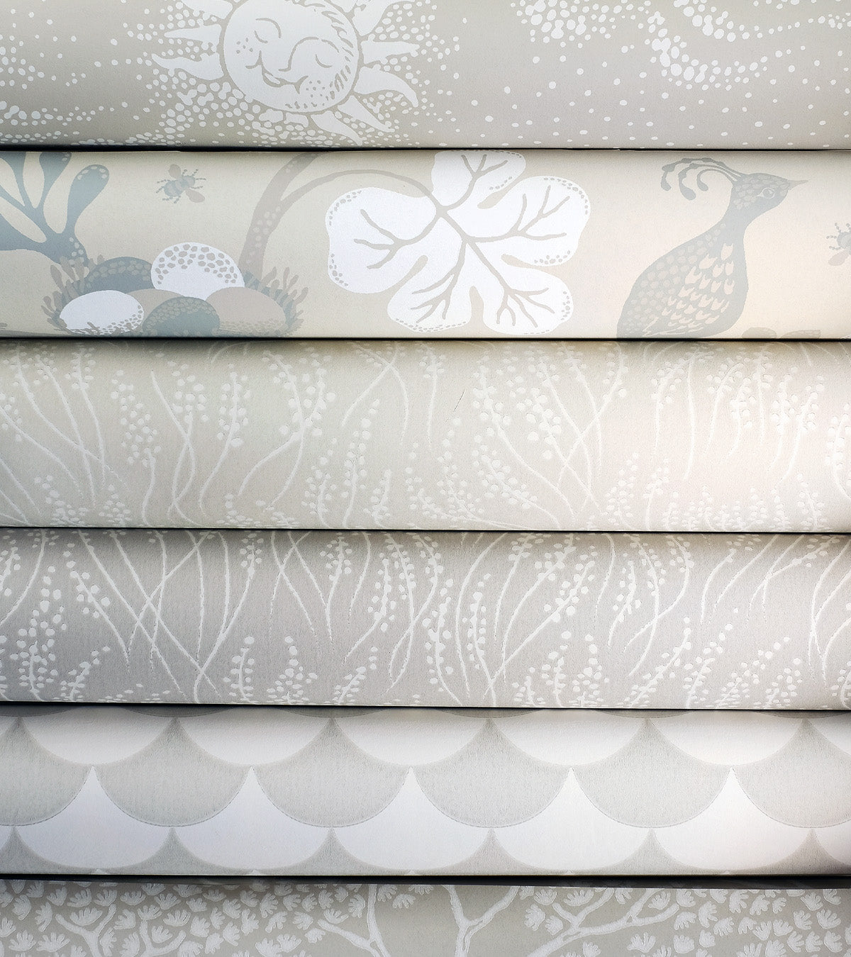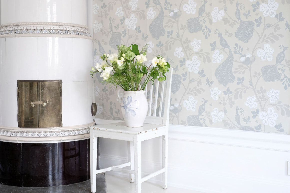 The print is drawn by hand by Camilla Lundsten. The wallpaper is surface printed, a process monitored entirely by the human eye and hand, to let the natural tactility of colour and paper show in all its beauty. All colours are mixed by hand and small variation in colour, size and pattern repeat can occur from batch to batch.